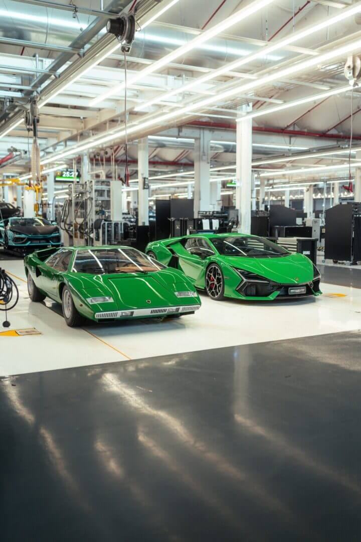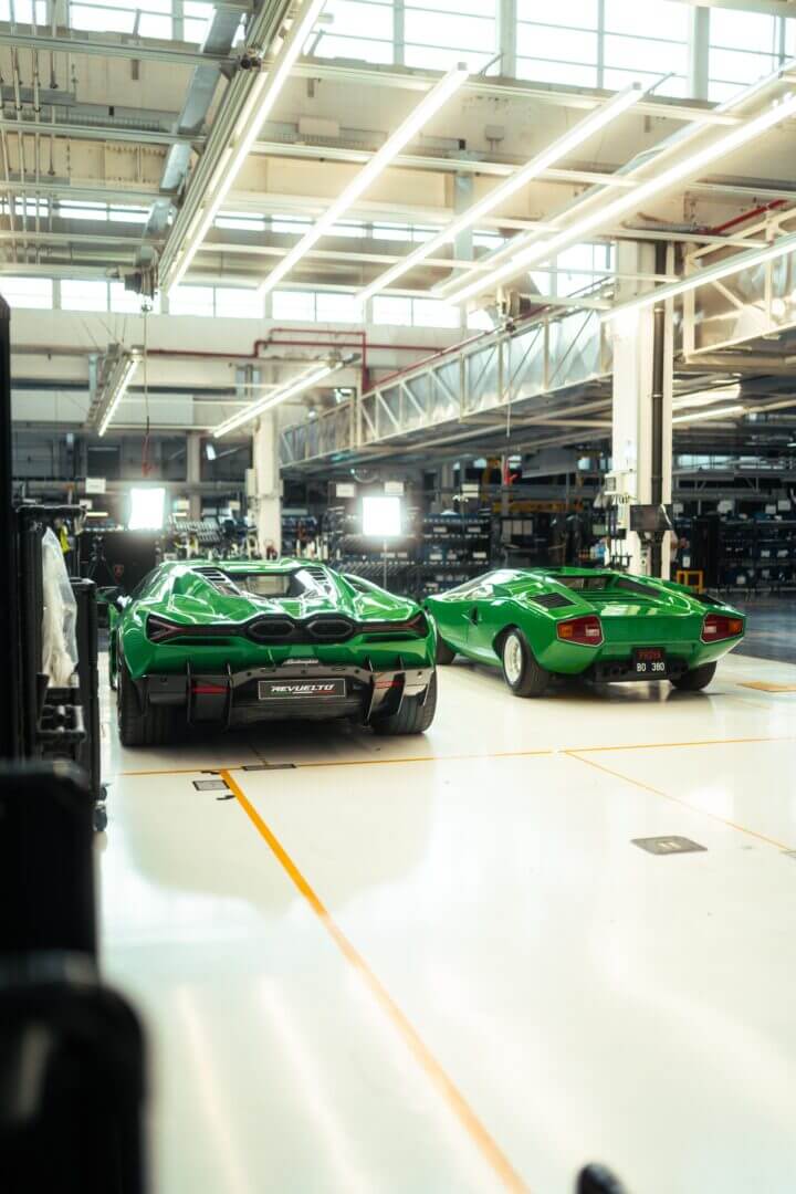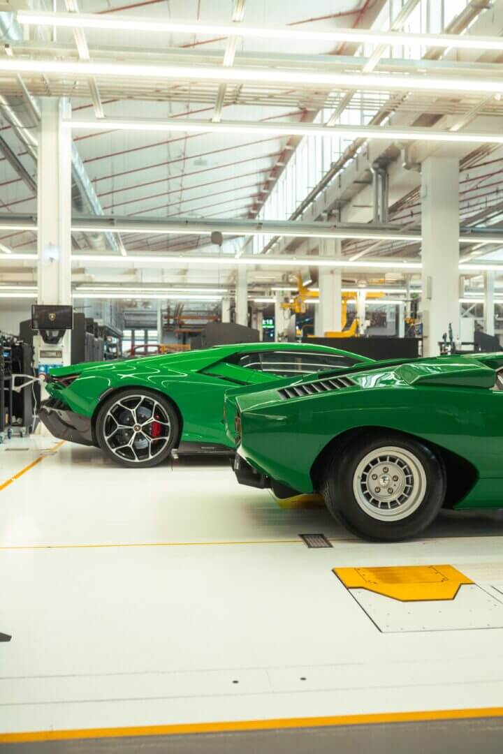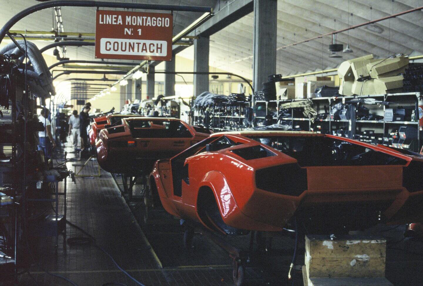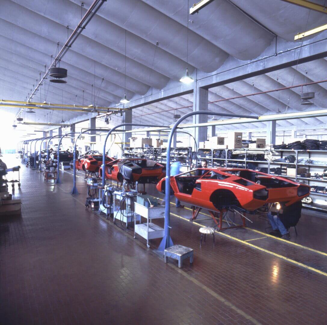 Das ursprüngliche Lamborghini-Werk umfasste 12.000 Quadratmeter bebauter Fläche, deren Bau 1963 begonnen und 1966 abgeschlossen wurde. Ab diesem Zeitpunkt wurden auch Getriebe und Differenziale im eigenen Werk gefertigt. Zur Fabrik gehörten damals die Fertigung, Büros, Testflächen und eine Werkstatt. Die Fertigung umfasste zwei Montagelinien: eine für Motoren und mechanische Bauteile, die andere für die Endmontage der Fahrzeuge. Am 18. Oktober 1968 kündigte Lamborghini die bevorstehende Fertigstellung von drei neuen Fabrikhallen an, die eine Erweiterung der bebauten Fläche um 3500 Quadratmeter mit sich brachte. Heutzutage ist das Werk mit einer Fläche von 346.000 Quadratmeter kaum wiederzuerkennen, aber die Fertigungslinie des Countach, die sogenannte LineaMontaggioN.1Countach aber immer noch dieselbe. Heute wird dort der neue Zwölfzylinder-Plug-in-Hybrid Revuelto montiert. Zur Zeit des Countach steckte die Montagelinie noch in den Kinderschuhen und die Arbeiten wurden fast alle von Hand ausgeführt. Die Karosseriebleche wurden nach der Bearbeitung auf einem Holzmodell überprüft und anschließend miteinander verschweißt und ausgerichtet. Dieser letzte Bearbeitungsschritt war wesentlich, da sich jedes von Hand gefertigte und montierte Teil leicht von den anderen, nur scheinbar identischen Teilen unterschied. Die vollständige Karosserie, damals noch aus Rohaluminium, wurde anschließend mit dem Rahmen zusammengefügt. Ein Schienen-Transferwagen brachte diese Baugruppe dann zu den verschiedenen Montagestationen, an denen die einzelnen mechanischen Komponenten verbaut wurden. Der Countach war auch das erste Modell, für das die hauseigene Polsterei Innenausstattungen fertigte, davor war sie nur für die Anpassung und Montage der Innenausstattungen der externen Lieferanten zuständig. Sie wurde schließlich zu einer selbständigen Einheit, die auch die Fertigung der Lederbezüge und Nähte übernahm und bildete die Basis für die essenziellen Möglichkeiten der Personalisierung, die Lamborghini seinen Kunden noch heute im Rahmen des Ad-Personam-Programms anbietet. Mittlerweile haben sich die Fertigungslinien in Folge anderer verwendeter Maschinen und Materialien deutlich verändert, die Prozesse laufen wesentlich organisierter, effizienter und ergonomischer. Während in den siebziger Jahren Aluminium verwendet wurde, wird heute Kohlefaser eingesetzt, die ebenfalls am Standort Sant’Agata Bolognese hergestellt wird. Was sich nicht geändert hat, ist die Leidenschaft und Sorgfalt, mit der die Mitarbeiter die neuen Autos herstellen.
