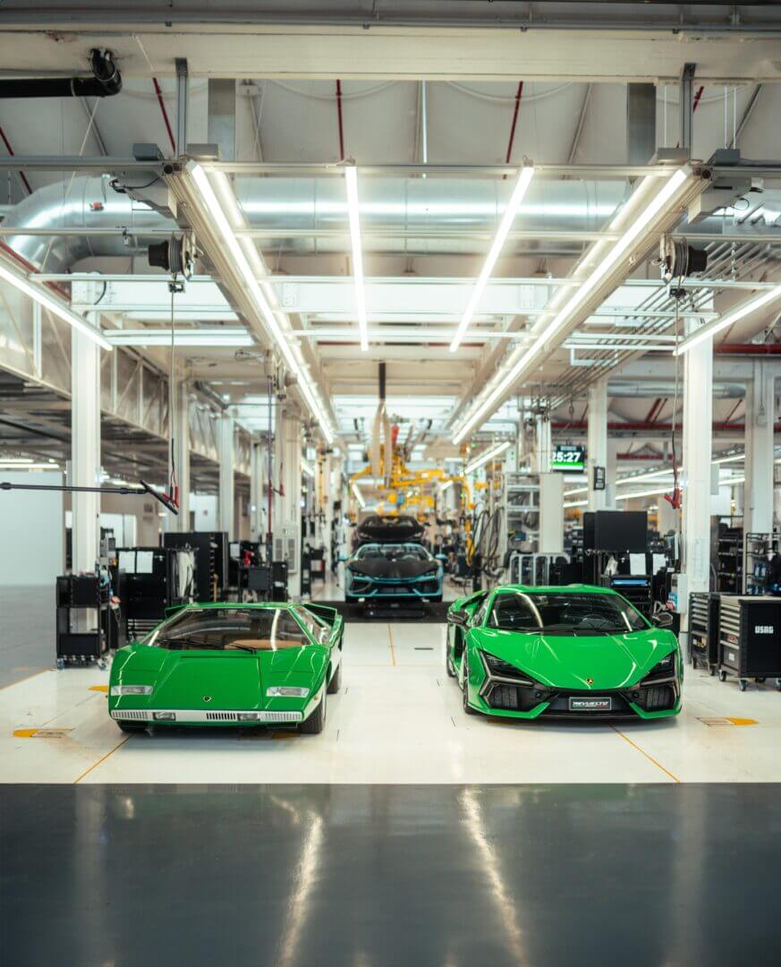 Ein halbes Jahrhundert liegt zwischen dem Countach und dem Revuelto, ein Zeitraum, in dem sich auch die Volumina verändert haben: In den 16 Produktionsjahren des Countach liefen 1999 Exemplare sowie der Prototyp LP 500 vom Band. In den elf Produktionsjahren des Diablo belief sich die Stückzahl auf 2903 Fahrzeuge, beim Murciélago waren es in neun Jahren mehr als 4000 Fahrzeuge. Der Aventador brachte es schließlich in elf Jahren auf sage und schreibe mehr als 11.000 Exemplare. Trotz dieser Unterschiede an ein und derselben Produktionsstätte haben der Countach und der Revuelto einiges gemeinsam. Das technische Gesamtkonzept mit Zwölfzylinderlängsmotor im Heck ist gleichgeblieben. Beim Revuelto kommt allerdings das Batteriepaket hinzu, das zur Verlagerung des Getriebes hinter den V12-Motor führte. Die Fahreinstellungen sind ebenfalls unverändert, ebenso wie die Scherentüren, die mit dem Countach geboren wurden und zum typischen Erkennungsmerkmal der V12-Modelle von Lamborghini avancierten. In puncto Design ist darüber hinaus eine bemerkenswerte Kontinuität erkennbar, die sich vom Countach über den Diablo und Murciélago bis zum Aventador erstreckt: Die feine optische Linie, die zwischen vorderem Kotflügel, Dach und Heck verläuft, wird Countach-Linie genannt.