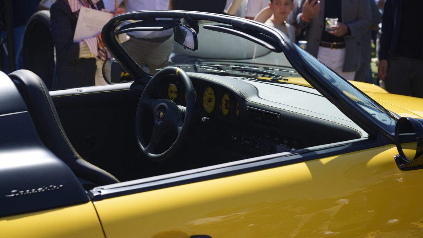Im Interieur dominiert schwarzes Leder mit gelben Ziernähten. Die Kopfstützen ziert ein eingestickter Speedster-Schriftzug. Das optische Highlight im Innenraum sind die Mittelbahnen der Sitze: Sie sind im „Checkered“-Design mit gelben und schwarzen Karos ausgeführt. Handwerklich ein Meisterwerk, denn jedes Karo wurde von Hand zugeschnitten und vernäht. Dasselbe Muster tragen der vordere, mit Leder ausgekleidete Kofferraum, das Car Cover sowie eine zum Auto passende Touring Bag. Carbon-Elemente an Instrumententafel, Mittelkonsole und Handbrems- sowie Schalthebel individualisieren den Innenraum weiter. Auch die Sitzrückseiten sind aus Carbon. Die Einstiegsleisten aus Carbon sind erstmals in einem Porsche 911 des Typs 993 beleuchtet, natürlich in „Ottoyellow“, und tragen einen individuellen Schriftzug.