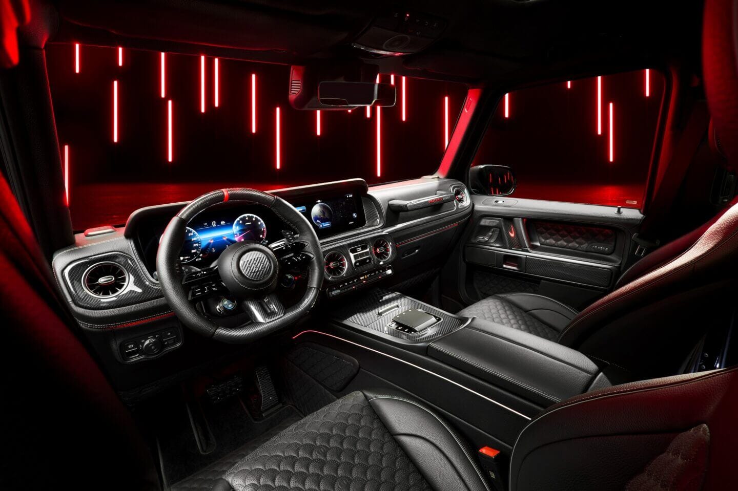 Innen bleibt BRABUS seiner Linie treu. Schwarzes Leder, Dinamica, sichtbares Carbon, Shell-Steppung, präzise Verarbeitung. In der Variante „Stealth Gray“ kommen rote Akzente hinzu, die das Interieur deutlich aggressiver wirken lassen als die schwarze „Signature Black“-Version. Die neuen Carbon-Schaltwippen verfügen über integrierte LED-Drehzahlanzeigen in grün, gelb und rot.