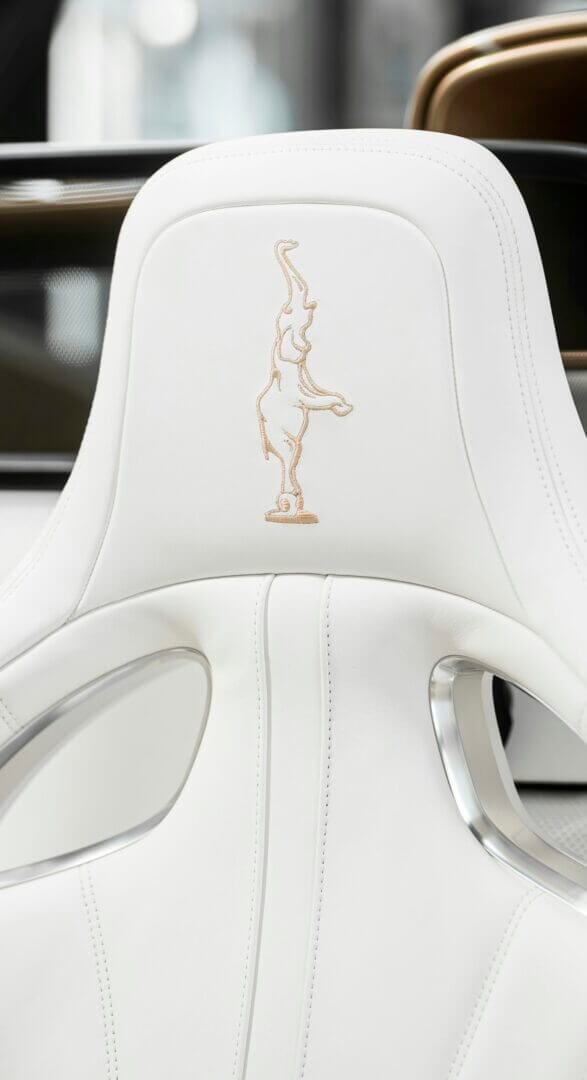Ein Detail mit Symbolkraft ist der „Tanzende Elefant“ – Rembrandt Bugattis Skulptur, die seit dem Type 41 Royale zur Markengeschichte gehört. Im Mistral taucht er wieder auf, integriert in Bedienelemente und Karosseriedetails.