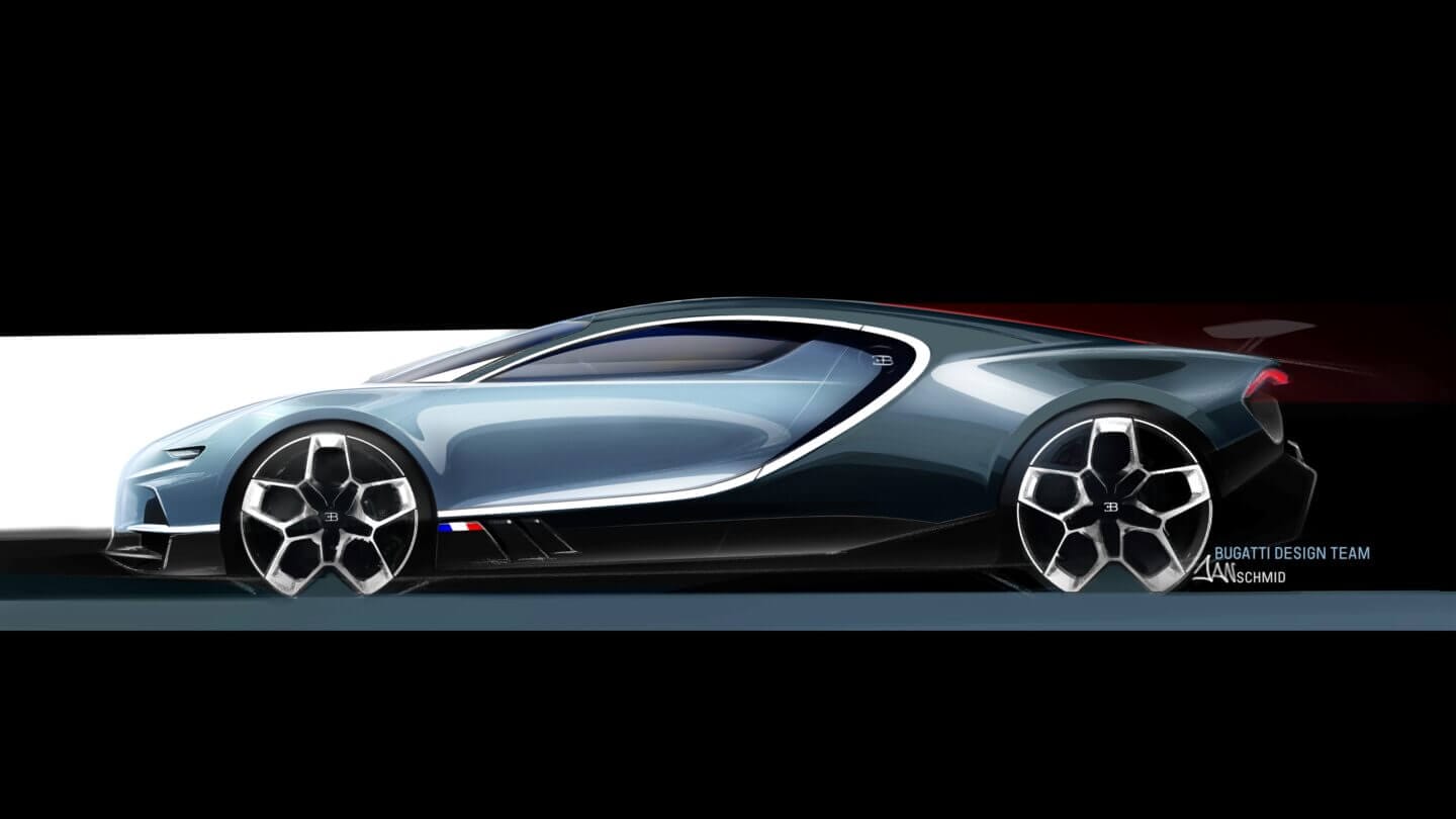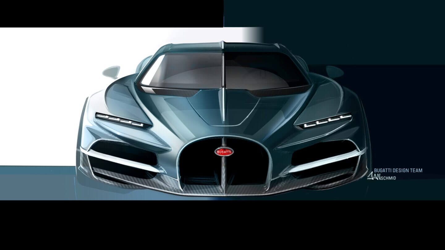 Wie jeder moderne Bugatti ist auch der Tourbillon von der Geschwindigkeit geformt. Die Fähigkeit, mit über 400 km/h zu fahren, erfordert, dass jede Oberfläche, jeder Lufteinlass und jede Kontur bis ins kleinste Detail perfektioniert ist. Nicht nur die Aerodynamik, sondern auch die Thermodynamik des Supersportwagens wurden optimiert. Dies ist der Leitgedanke des Tourbillon, der sich um vier von der Geschichte inspirierte Bugatti Designelemente herum entfaltet: den hufeisenförmigen Kühlergrill, die Bugatti-Linie, den Mittelsteg und die zweifache Farbteilung.