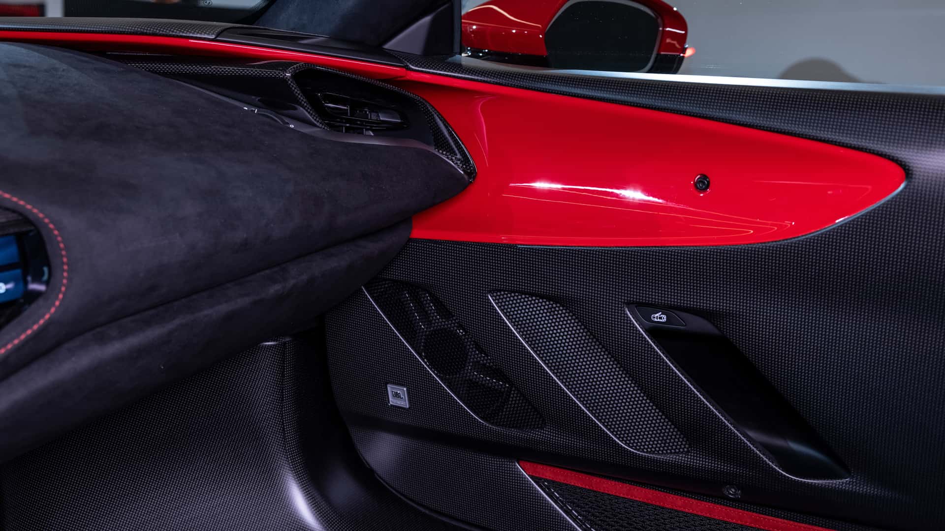 Die Änderungen im Innenraum sind eher geringfügig. Der SF90 XX verfügt über ein Alcantara-Armaturenbrett und viele Karbonfaser-Zierteile. Der Wählhebel ist weiter vorne angebracht. Die Sitze sind einteilig, aber elastische Verkleidungen verbinden den oberen und unteren Teil, sodass die Insassen die Rückenlehne verstellen können.