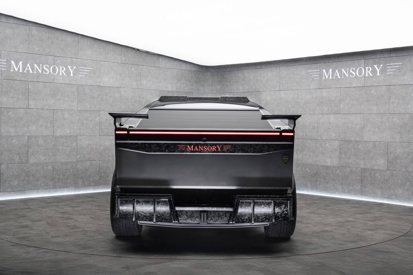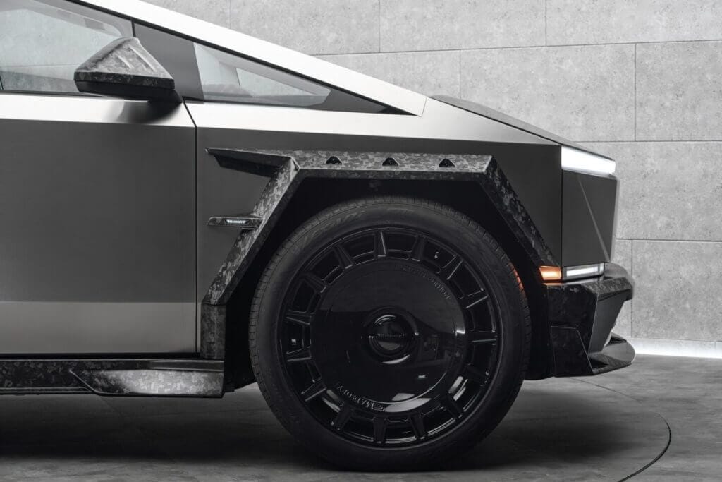 Der deutsche Veredler dem Tesla eine Komplettkur verpasst. Das bedeutet: Carbon, Carbon und – richtig – noch mehr Carbon. Kotflügel, Front- und Heckstoßfänger und zwei Heckflügel – alles aus edlem, strukturiertem Karbon. Und dazu eine völlig neu gestaltete Front. Sieht ein wenig so aus, als hätte jemand versucht, den Stealth-Bomber unter den Pick-ups zu bauen — um dann festzustellen, dass ein bisschen Rennsport-Flair auch nicht schaden kann.