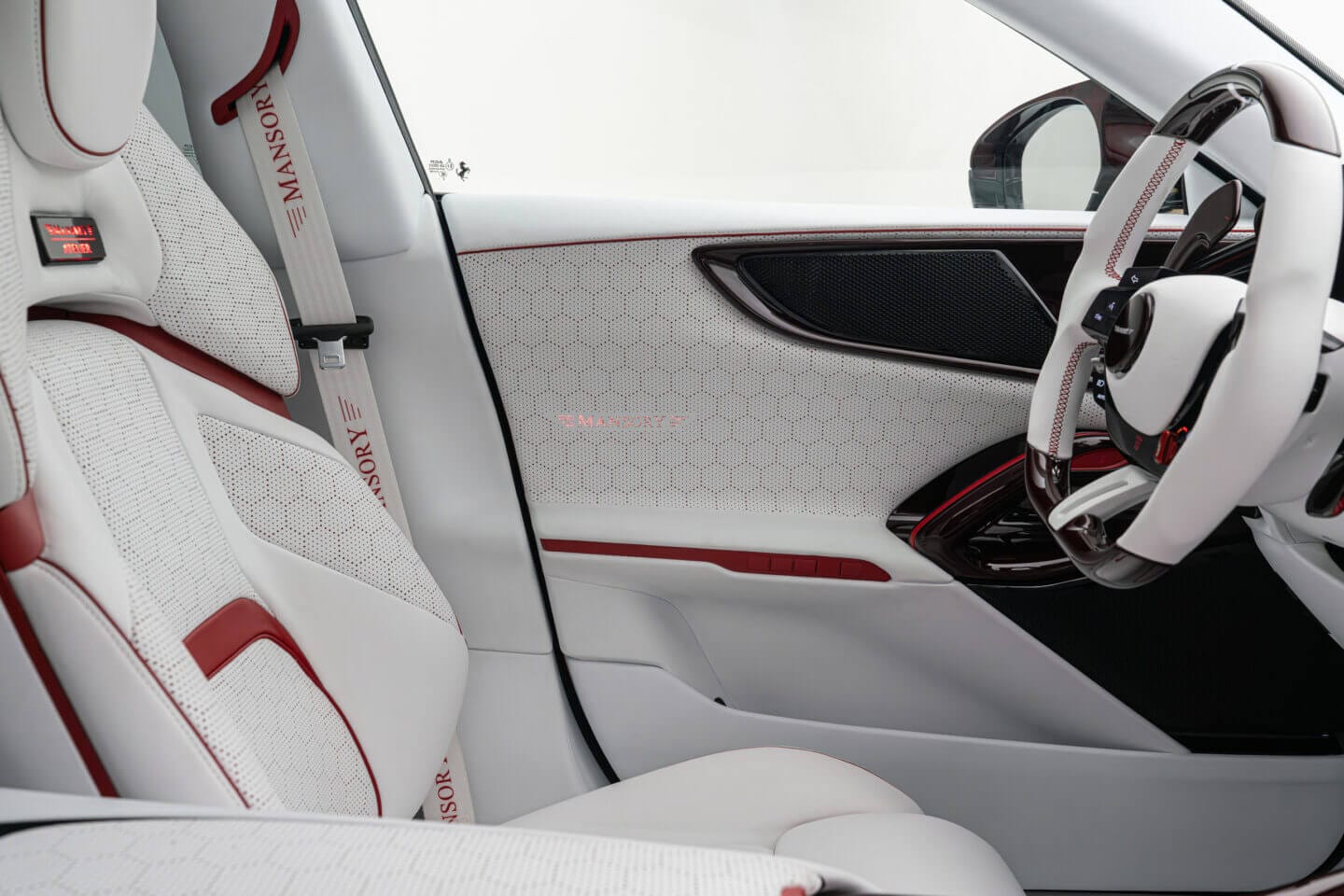 Das Highlight? Ganz klar: Das Mansory-Carbon-Leder-Sportlenkrad mit „Schaltblitz“. Dieser Schaltblitz – eine LED-Anzeige, die den Fahrer optisch darauf hinweist, wann der ideale Moment zum Schalten ist – ist nicht nur praktisch, sondern bringt auch ein Stück Formel-1-Feeling auf die Straße. Natürlich dürfen auch die kleinen Details nicht fehlen: maßgeschneiderte Sicherheitsgurte mit Mansory-Logo, exklusive Aluminiumpedale und speziell gefertigte Fußmatten – hier wird nichts dem Zufall überlassen.