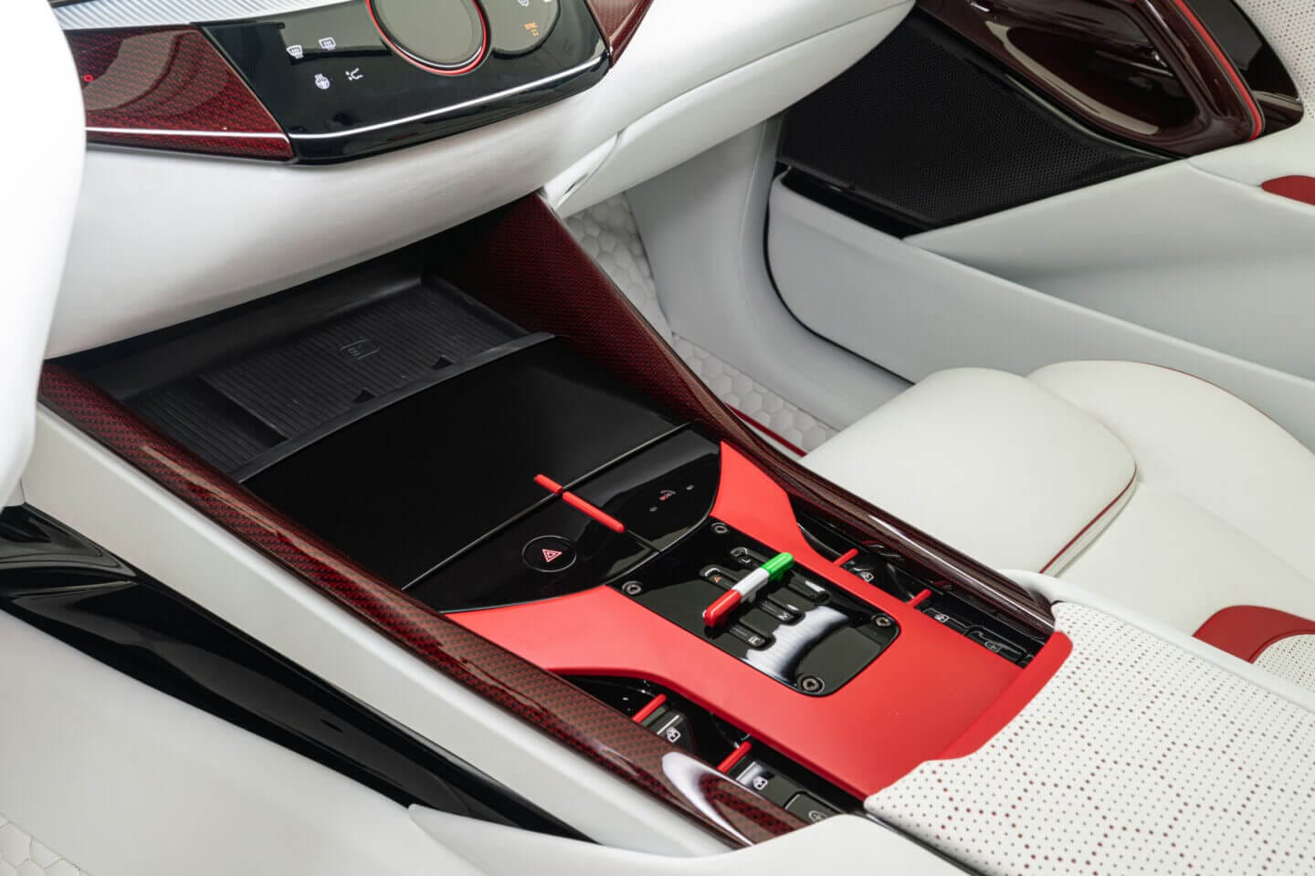 Wer denkt, dass nach all dem Carbon und den äußeren Inszenierungen im Innenraum nichts mehr zu holen ist, irrt sich. Der Innenraum ist in elfenbeinfarbenes Leder gehüllt, das durch rote Kontraste betont wird. Auch hier fehlt das Carbon natürlich nicht – in präzise und zahlreich gesetzten Akzenten bringt es eine sportliche Note in den ansonsten luxuriös gestalteten Innenraum.