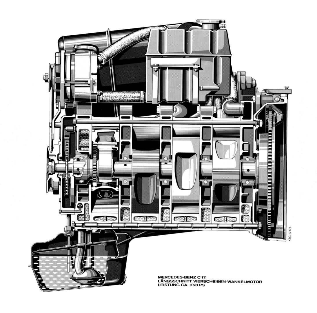 Faszinierende Sportwagenikone und Medienliebling, rollendes Labor für die Entwicklung des Wankelmotors sowie zur Erprobung neuer Technologien, legendärer Rekordwagen: Keine Frage, der Mercedes-Benz C 111 ist ziemlich facettenreich. Seine zweite Entwicklungsstufe ist der C 111-II mit der 257 kW (350 PS) starken Vierscheiben-Ausführung des Rotationskolbenmotors M 950 F (viermal 602 Kubikzentimeter Kammervolumen).