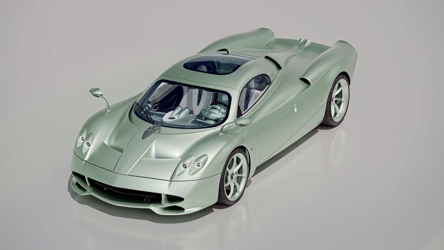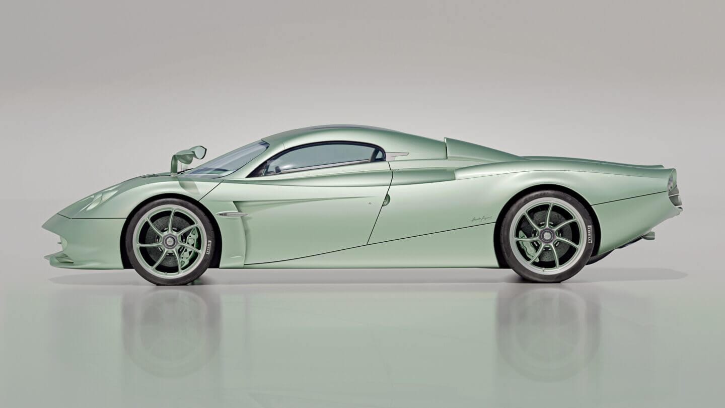 Anstelle eines klassischen Verdecks setzt Pagani auf ein neu konstruiertes Hardtop aus Polycarbonat, das sich nahtlos in die Dachlinie einfügt. Der transparente Dachbogen wirkt wie die Fortsetzung der Frontscheibe und verleiht der Gesamtform eine tropfenartige Silhouette. Die Seitenansicht ist klar gegliedert – ohne sichtbare Lufteinlässe. Die Ansaugung erfolgt über versteckte NACA-Öffnungen im Unterboden.