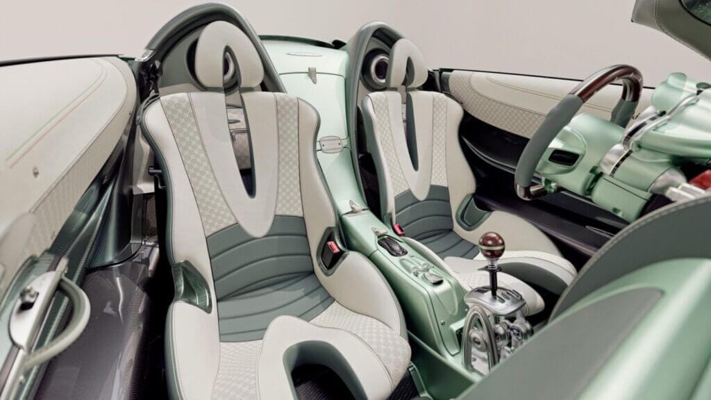 Der Innenraum orientiert sich an klassischen Sportwagen, ohne nostalgisch zu wirken. Das Materialkonzept umfasst handgehämmertes Leder, eloxiertes Aluminium, Mahagoni und freiliegende Mechanik. Der Schalthebel – je nach Konfiguration mit offener Kulisse – ist mechanisches Objekt und Skulptur zugleich. Das Lenkrad zitiert formal klassische Nardi-Designs, besteht jedoch aus Carbon mit Holz- und Aluminium-Einsätzen.