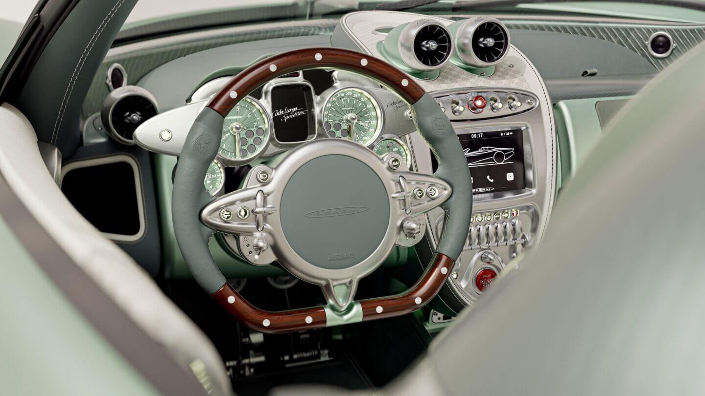 Die Basis bildet ein modifiziertes Monocoque aus Carbo-Titanium HP62-G2 und Carbo-Triax HP62 – zwei von Pagani entwickelte Hochleistungsverbundstoffe mit Titanfasern. Sie kombinieren geringe Masse mit hoher Torsionssteifigkeit und bilden das Rückgrat des nur 1.270 Kilogramm leichten Speedsters – ein beachtlicher Wert angesichts der Dimensionen (Länge: 4.912 mm).