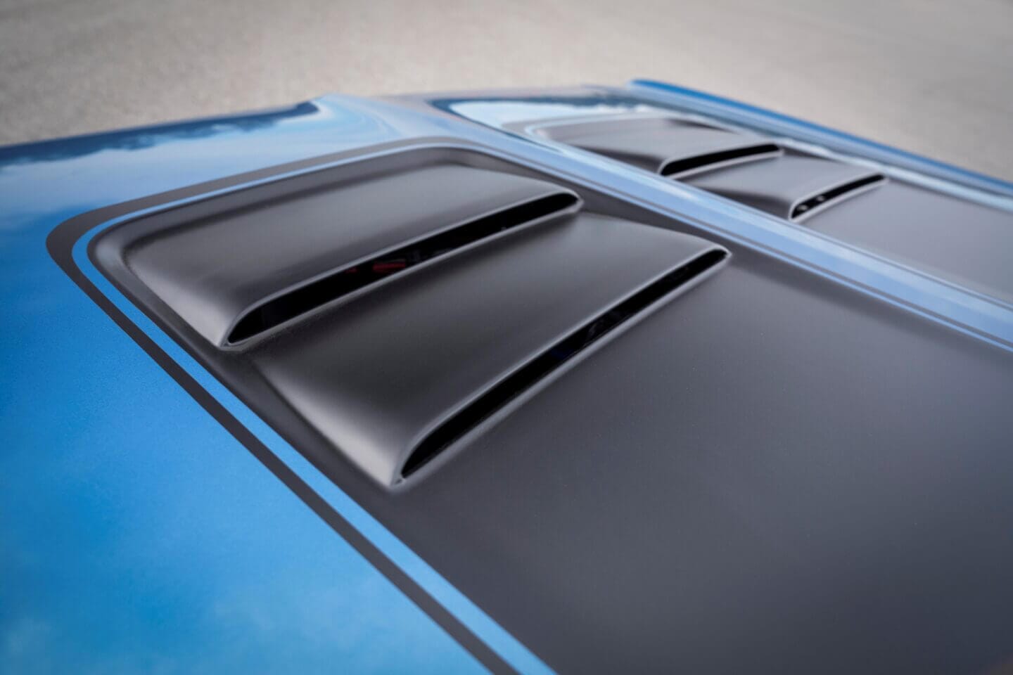 Die GTX Electromod Concept-Version verfügt über eine maßgefertigte Motorhaube aus Kohlefaser mit zwei funktionalen Luftauslässen, die durch zwei Satin Black-Streifen betont werden und eine Hommage an das Original der Plymouth GTX darstellen.