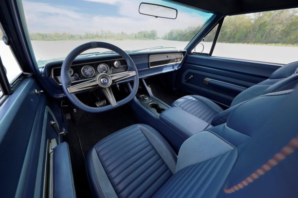Die blauen Türverkleidungen im Innenraum sind mit Vintage Bronze-Akzenten und manuellen Fensterkurbeln ausgestattet, dazu gibt es Mopar-Edelstahl-Pedalabdeckungen um den klassischen Look zu bewahren.