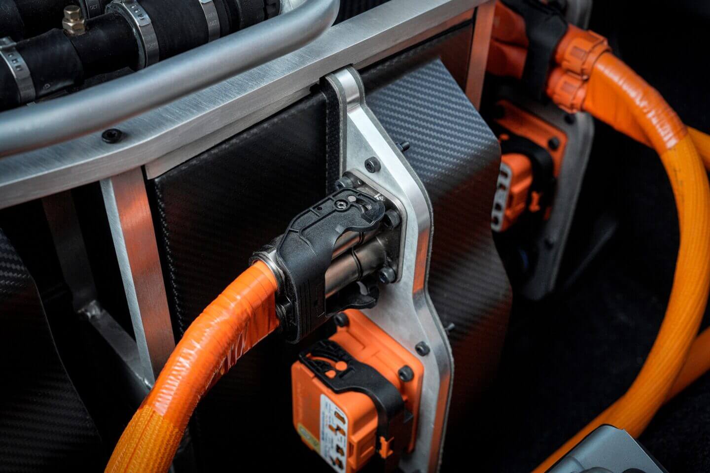 Unter der Kohlefaser-Motorhaube verbirgt sich ein skalierbares 400-Volt, 250-Kilowatt-Elektroantriebsmodul (EDM), das über maßgeschneiderte, isolierte Motorhalterungen am Rahmen befestigt ist. Alle Halterungen sind auf eine einfache Herstellung ausgelegt und jede Strebe oder Halterung kann per Wasserstrahl aus 6061-Aluminiumlegierung geschnitten werden.